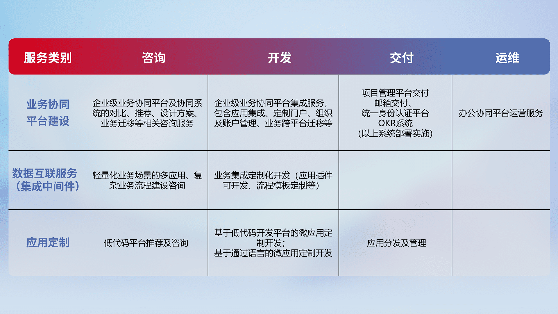 针对钉钉、、企微、、、、IDaas等平台级产品提供产品的规划、、、方案、、、、交付、、、定制化开发等服务,,,实现如统一协同办公、、智能客户服务、、混合会议管理、、、智能数据查询、、、等业务场景,,实现数字化转型。。。